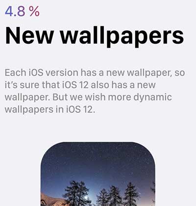 من مطالب المستخدمين أن تقوم آبل بدعم الخلفيات في iOS 12، حيث يرجون أن تضيف المزيد من الخلفيات الاحترافية، سواء المتحركة أو الثابتة، طبعا وإن كان يظهر هذا المطلب عاديا باعتبار إمكانية الحصول على آلاف الخلفيات المخصصة للأيفون والآيباد من شبكة الانترنت، إلا أن توفيرها مع النظام ابتداء هو ما طالب به المستخدمون.