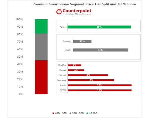 أما الجزء الأخير من الرسم التوضيحي، يشير إلى الهواتف التي تتراوح قيمتها بين 400 و 600 دولار، وهنا تظهر الهواتف الصينية حيث تتساوى حصة أوبو مع ابل في هذه الفئة بنسبة 22% ، وتقترب هواوي من سامسونج بنسبة 14% و 16% على التوالي، يليها شاومي ووان بلس.